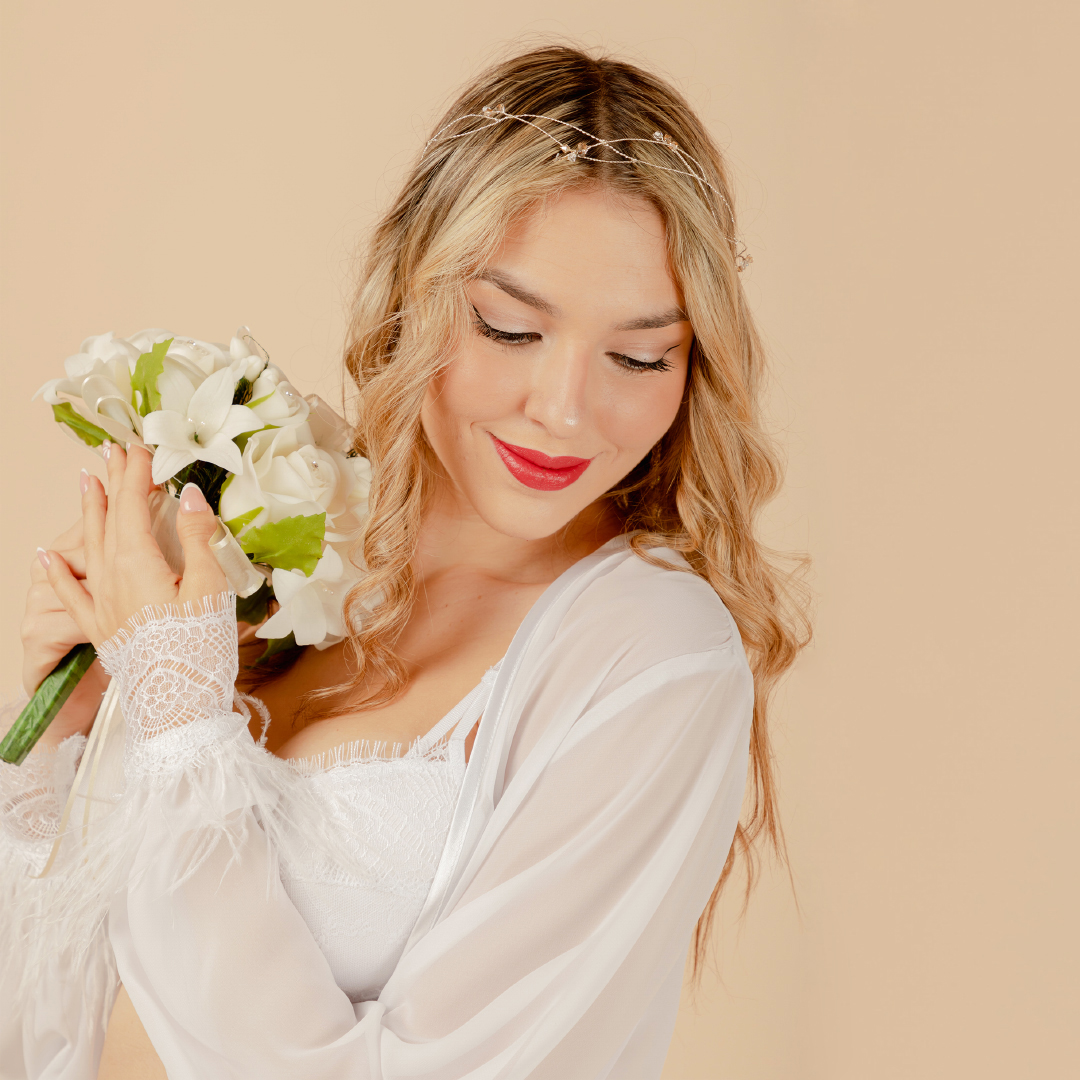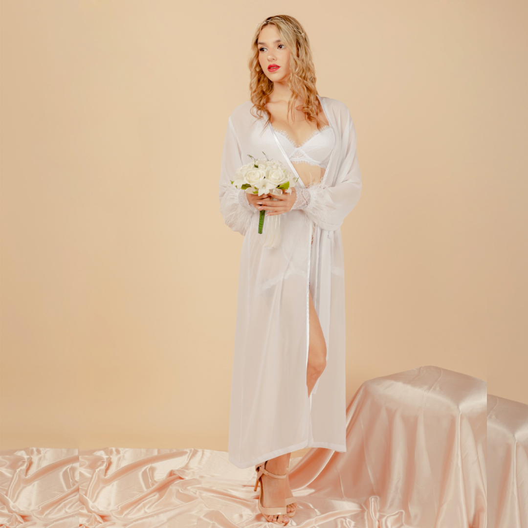 Material gasa larga con manga larga detalles de encaje bordado y lumas.