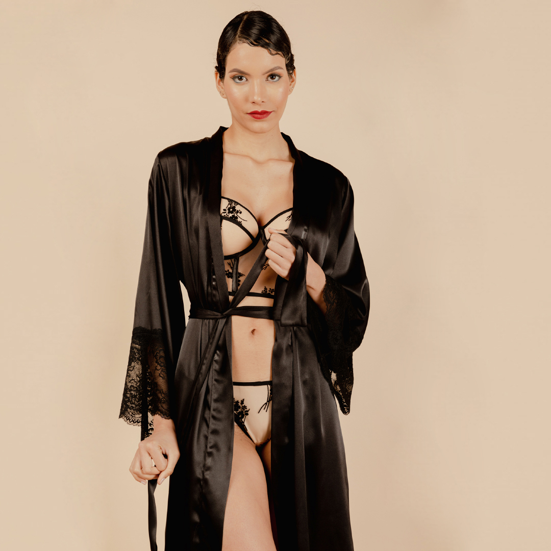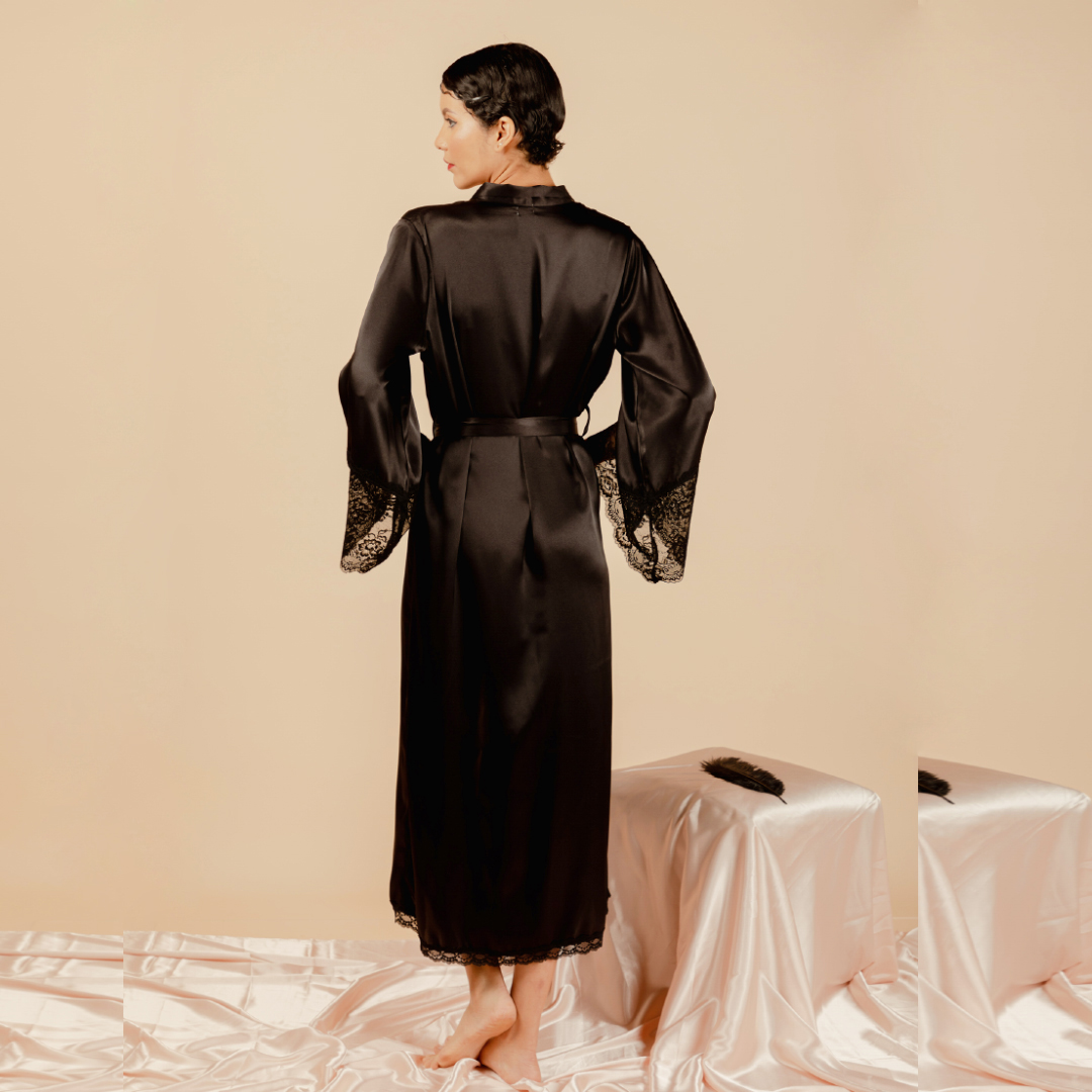Bata larga de seda con mangas largas y encaje